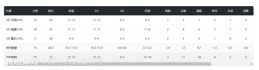 对阵河南U18,15分钟13中11,罚球6中4,拿到26分3篮板1盖帽,命中率84.6%;