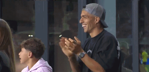 禁赛无法出场的苏亚雷斯,在看台上乐开了花,为梅西的精彩表演鼓掌叫好。