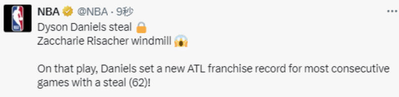 根据NBA官方发布的数据统计显示,丹尼尔斯已经连续62场比赛有抢断入账,他也超越了道格-里弗斯,创造老鹰队史新纪录。