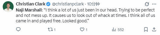 马绍尔说道:“有些事情是我们心里都清楚的。呃,有些事不能只停留在‘我们要去做’的口头层面,必须真正付诸行动。今晚我们做到了,我为我的队友们感到骄傲。要知道,我们打得非常拼。即便在第四节陷入被动,兄弟,每个人都拼尽了全力,太不可思议了。这场胜利是全队共同努力的结果,希望这能成为一个新的开始。之前我们太钻牛角尖了,其实篮球本该充满乐趣,你懂的。我感觉今晚我们是带着活力在打,也享受着看彼此打球的过程,最后成功赢下了比赛。”