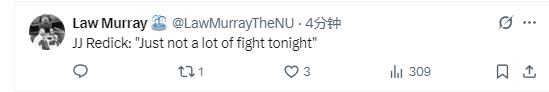 在谈到赛后如何看待这场比赛时,雷迪克表示:“我们不会翻篇,肯定会复盘比赛。”而在谈到比赛前2分钟自己是否意识到今晚不会顺利以及他看到了什么情况时,雷迪克表示:“我什么也没看到。”
