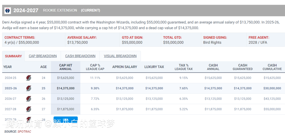 阿夫迪亚今年的薪水是1437万,而且他还有三年合同,余下两年是1312万、1187万,没错他四年5500万的合同还是递减合同,他就拿着这份廉价合同打成了开拓者的第一球星,他每一场都要操持这两亿的心,本赛季他大概率要进入全明星了。
