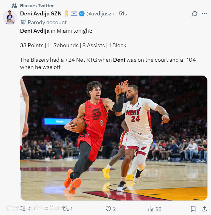 这场比赛前开拓者官方就晒出了球队第一明星阿夫迪亚前八场比赛的数据,24.4分6.5篮板4.5助攻0.8抢断0.9盖帽,命中率46.5%,三分命中率36%,阿夫迪亚已经打出全明星身手。