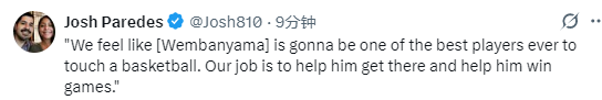 福克斯:我们这里没人能单枪匹马搞定一切。显然,我们知道我们有文班亚马。不管人们叫他怪物、外星人还是别的什么,他就是这么厉害。但我们的职责就是站出来帮助他。我们觉得,只要他多传球,他会成为有史以来最棒的球员之一。我们的任务就是帮他实现这个目标,帮他赢球。