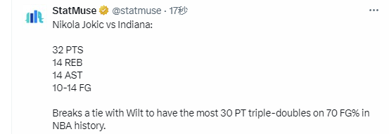 除此之外,约基奇还成功超越张伯伦,成为NBA历史上以70%命中率砍下30+三双次数最多的球员。
