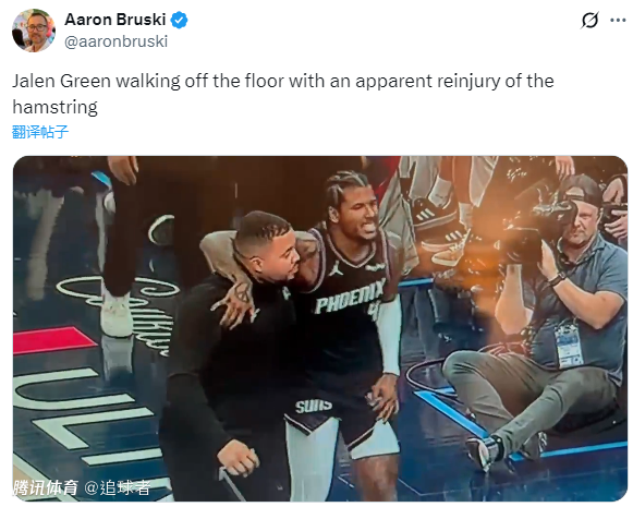 杰伦-格林的太阳生涯首秀十分完美,可他为太阳出战的第二场比赛就遭遇伤病——太阳对阵快船打到第一节最后1分钟,杰伦-格林持球突破时意外受伤,无明显对抗,惨遭右腿筋伤病,无法继续比赛,一瘸一拐十分痛苦,痛得龇牙咧嘴,右腿根本不敢受力,被两人搀扶架出球场,返回更衣室接受检查。