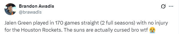 过去的两个赛季,杰伦-格林连续两年为火箭打满82场,可加盟太阳的第一年,格林接连拉伤左腿筋和右腿筋,对此美球迷吐槽太阳被诅咒了。