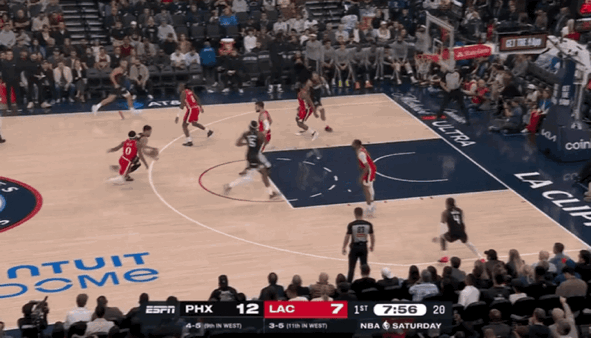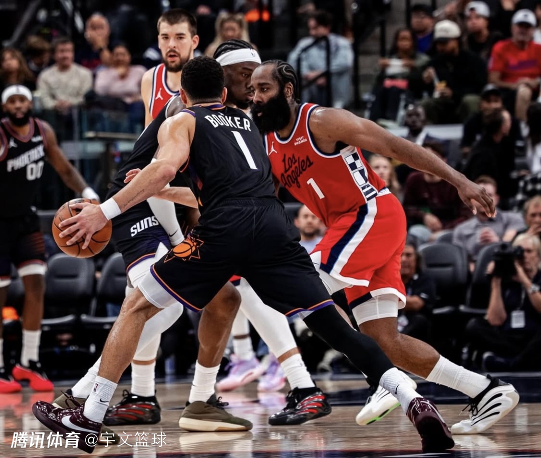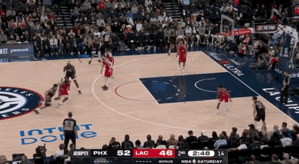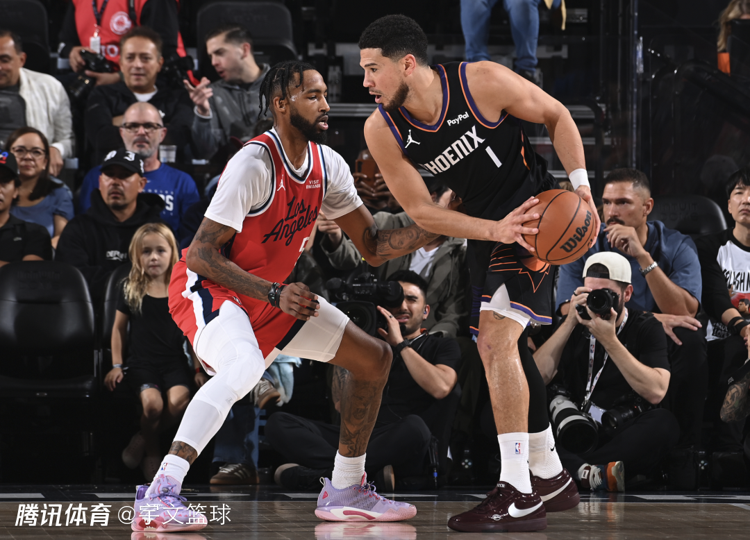 太阳在末节比赛成功稳住局势,重新建立双位数领先,但快船还是顽强地试图追分,布克在最后7分41秒回归,两队一度展开三分互飙。快船将防守重心全部放在布克身上,布克在圈顶持球想要启动时,快船球员就会对他采取包夹,不给他轻易串联起整支队伍的机会。