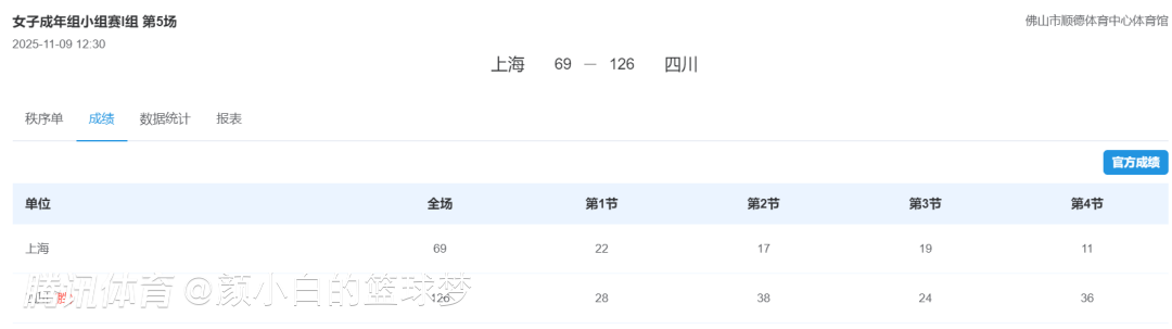2025-11-09 19:10北京时间11月9日,全运会女篮成年组,四川女篮126-69大胜上海女篮拿到三连胜。这场比赛已经是四川队在小组赛三场打得最‘艰难’的一场,因为净胜分竟然没有超过60分,四川女篮坐拥多位国手,是本次全运会的夺冠第一热门。