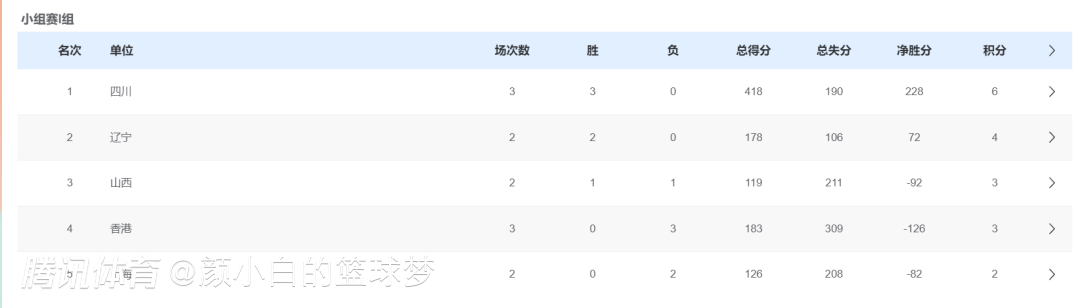 四川队目前在A组排名第一,三场比赛净胜228分,场均净胜76分。第一场打山西净胜98分,第二场打中国香港队净胜73分,有多位国手的四川女篮统治力太恐怖。B组头名广东女篮,前两场比赛只净胜91分,跟四川这个差距还是挺大的。