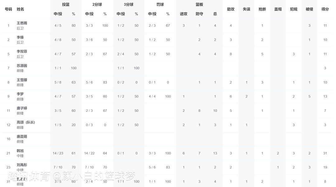 这场比赛四川队7人得分上双,大名单12人有11人登场,王思雨11分,李缘10分,李双菲11分,王雪朦10分,李梦13分,刘禹彤19分,最炸裂的就属韩旭拿到31分13篮板。