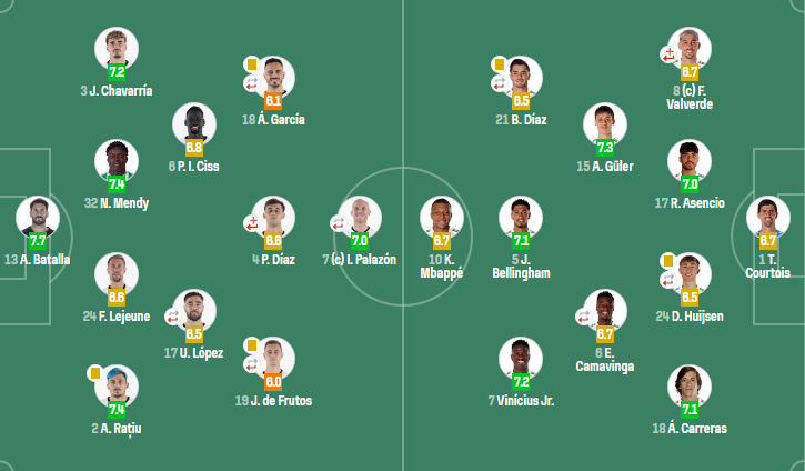皇家马德里:库尔图瓦;巴尔韦德(83'阿诺德),劳尔-阿森西奥,赫伊森(46'米利唐),卡雷拉斯;居莱尔,卡马文加(79'罗德里戈);布拉欣-迪亚斯(71'塞瓦略斯),贝林厄姆,维尼修斯;姆巴佩