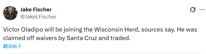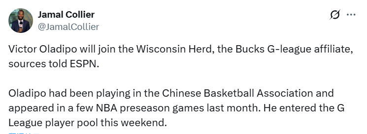 2025-11-10 05:10北京时间11月10日,据ESPN记者科利尔报道,两届全明星后卫奥拉迪波即将加入雄鹿队的发展联盟附属球队——威斯康星鹿群队。
