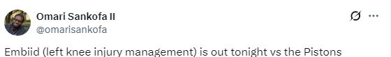 76人官方:恩比德因左膝伤病管理将缺席对阵活塞
