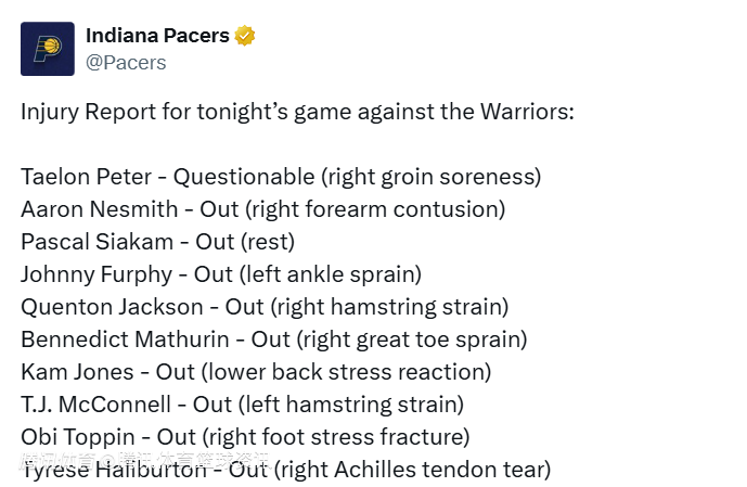 2025-11-10 07:00北京时间11月10日,NBA常规赛继续进行,步行者对阵勇士。赛前,步行者方面公布球队本场比赛伤情报告,共计9人缺席。