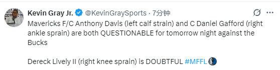 内线依旧告急!独行侠官方:对阵雄鹿浓眉加福德出战成疑 莱夫利大概率缺阵