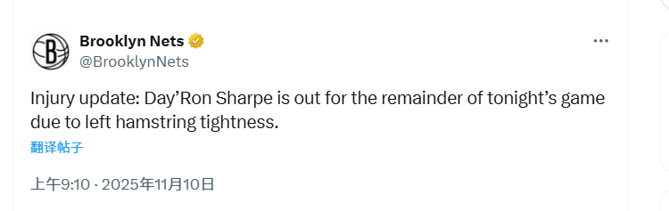 2025-11-10 09:30北京时间11月10日,NBA常规赛继续进行,篮网队对阵尼克斯队。在下半场比赛中,篮网队官方宣布,夏普因左腿筋紧张,将缺席今晚剩余的比赛。
