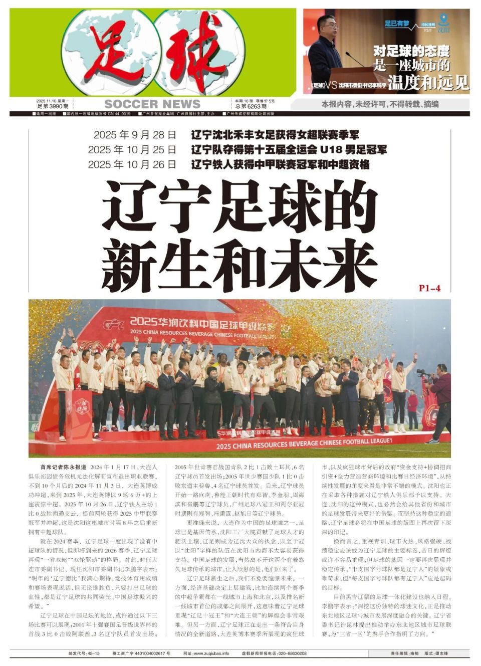 2025-11-10 10:50特约撰稿/沈君 11月8日,中甲收官战,辽宁铁人队捧起冠军奖杯,继大连英博去年升入中超后,辽宁足球迎来了第二支中超球队。不久前,辽宁U18男足在第十五届全运会上点球大战力克劲旅山东队,时隔12年再度摘得该项目金牌;首次征战女超联赛的辽宁女足获得季军,险些创造中国足坛的“凯泽斯劳滕神话”。