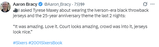 在谈到最后一个回合的战术安排时,马克西说道:“我们本来计划把球回传给乌布雷,给他创造突破的机会。但对手那边换防了,我们的战术没能跑出来。所以到那个时候,你也知道,时间所剩不多,已经没法靠突破造杀伤(让对手犯规)来拿两分了,所以当时就只能尝试投三分。”马克西还称赞了76人队的黑色球衣,表示球衣很好看。