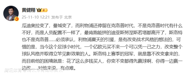 2025-11-10 13:10北京时间11月10日,英超联赛第11轮,曼城3-0利物浦。而知名媒体人黄健翔也发文谈到了利物浦。