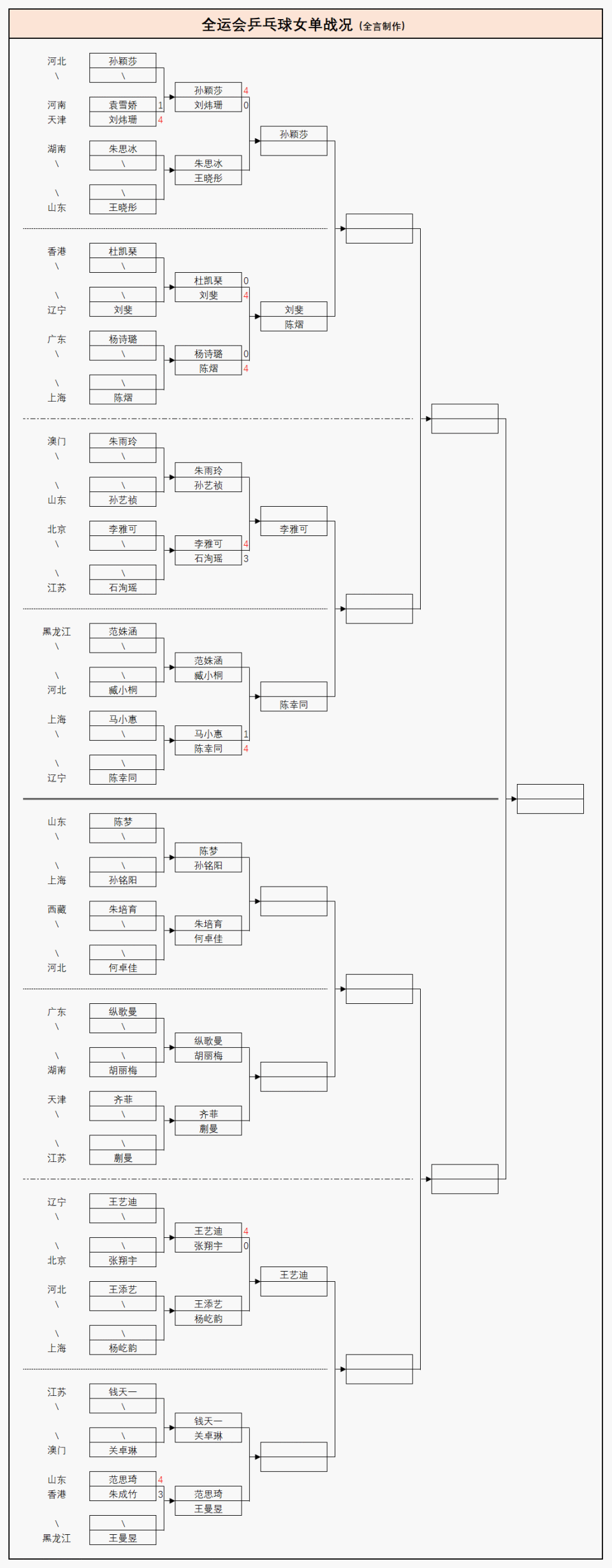 2025-11-10 15:30北京时间2025年11月10日下午,全运会乒乓球比赛结束第四天上半场的单打较量,新增4男3女晋级16强,其中3位世界冠军樊振东、孙颖莎、陈幸同晋级,2位全国冠军周雨、刘炜珊被横扫,国家队名将陈垣宇、徐海东一轮游,详细战况请看下文。