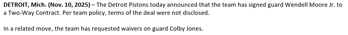2025-11-11 06:00北京时间11月11日,活塞官方发布公告,宣布球队已正式签下小温德尔-摩尔并裁掉科尔比-琼斯。