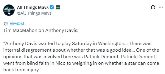 不再盲信哈里森?独行侠内部爆发分歧 老板杜蒙特介入浓眉复出决策
