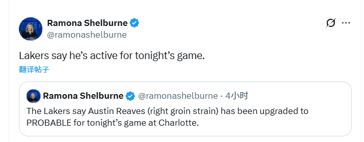 最新消息显示,里夫斯可以出战本场比赛,而稍早时湖人队曾宣布,里夫斯(右侧腹股沟拉伤)的出战状态已升级为大概率出战。