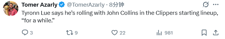 当被问及是否担心比尔的髋部伤势会是长期问题时,泰伦-卢回应道:“是的,先生。”快船队公关表示,他们会在赛前告知比尔的最新伤情。在谈到科林斯首发的情况时,泰伦-卢说道:“我会让他先在首发阵容中打一段时间看看。”