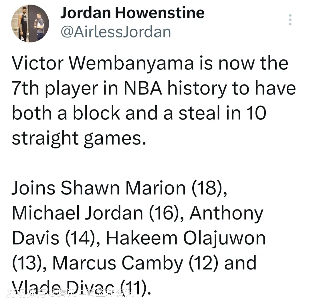 根据数据统计显示,凭借半场表现,文班亚马成为NBA历史上第7位连续10场比赛均送出盖帽和抢断的球员。他加入了以下球员的行列——