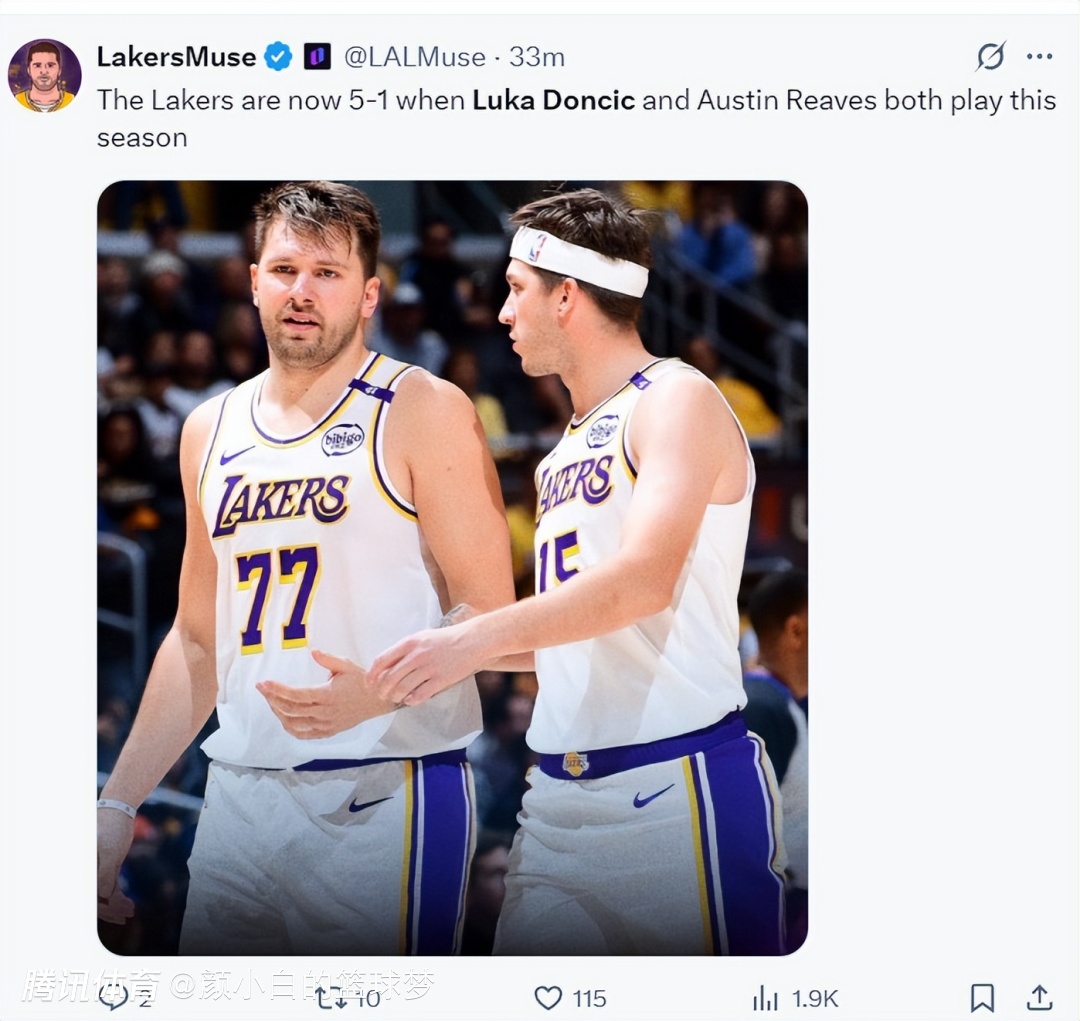 本赛季东契奇、里夫斯同时出战时湖人的战绩是5胜1负,此役里夫斯复出17中7,拿到24分7助攻5篮板2抢断,湖人双核驱动的确很难被防守。