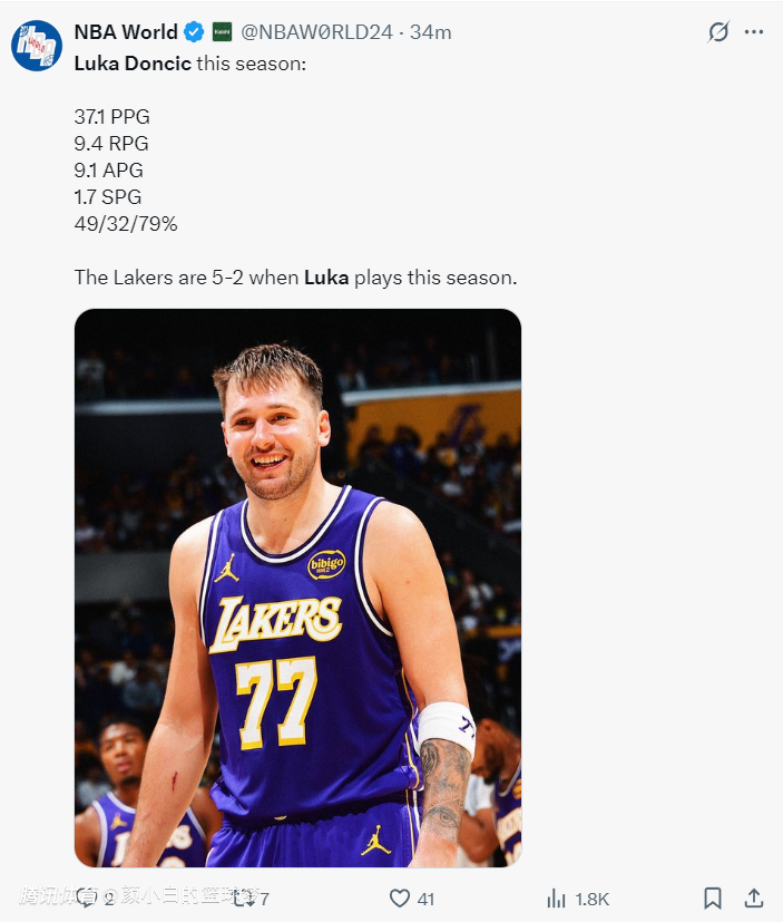 本赛季东契奇的数据是场均37.1分9.4篮板9.1助攻1.7抢断,命中率49%,三分命中率32%,罚球命中率79%,他在场时湖人5胜2负,这个数据实在是过于爆炸。