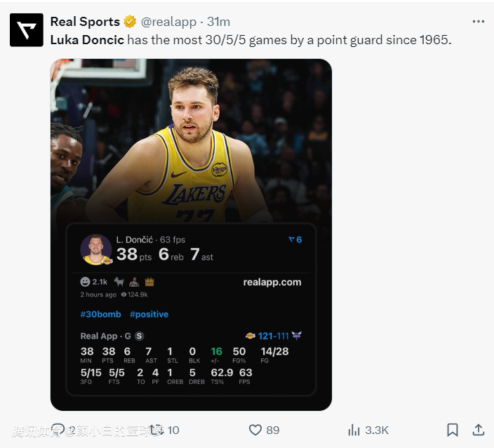 此役后,本赛季只有扬尼斯的30+5+5场次比东契奇多,东契奇也是自1965后拿到最多单场30+5+5的控球后卫,也就是最近60年首人纪录。
