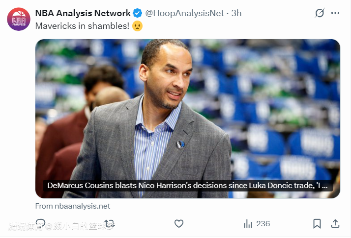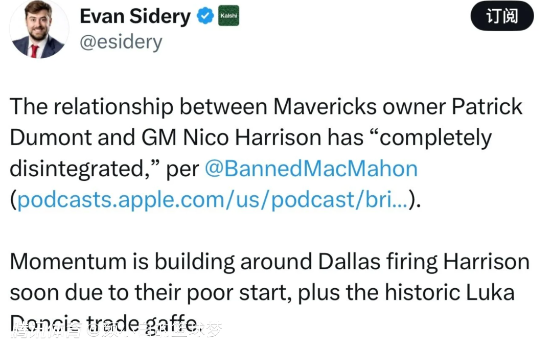 根据NBA记者埃文-斯迪瑞的报道,相关人士表示,独行侠老板和总经理尼科·哈里森之间的关系已经彻底破裂!由于独行侠开局不利,加上东契奇的交易失误,外界普遍认为独行侠很快就会解雇哈里森。