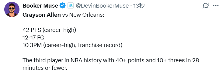 2025-11-11 12:20北京时间11月11日,NBA常规赛继续进行,太阳队对阵鹈鹕队。格雷森-阿伦在第四节比赛中已经得到42分,投进10个三分球,两项数据均创生涯新高。