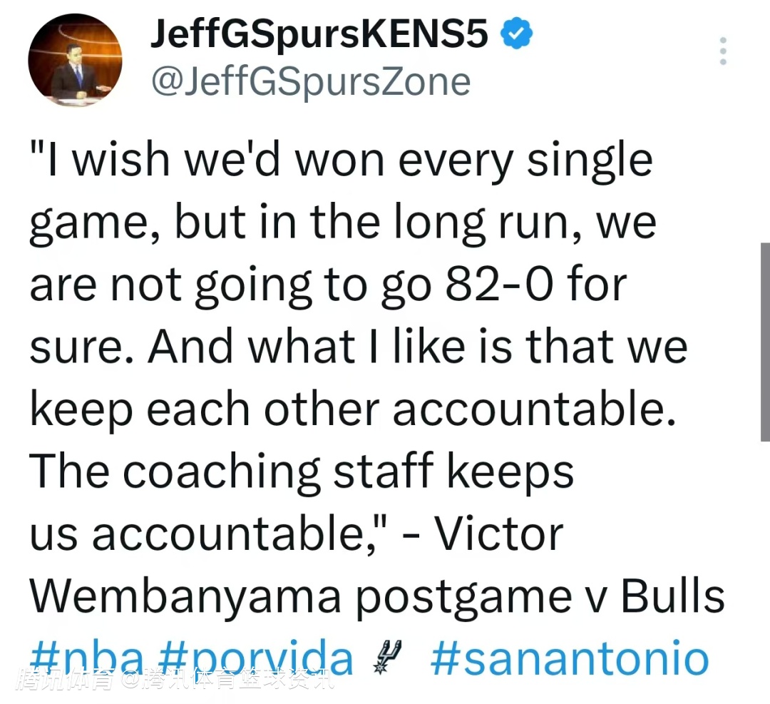 文班亚马还表示:“我希望我们能赢得每一场比赛,但从长远来看,我们肯定不可能取得82胜0负的战绩。我喜欢的是,我们会互相督促,教练组也会严格要求我们。”