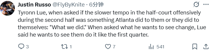 2025-11-11 14:40北京时间11月11日,NBA常规赛继续进行,快船队102-105不敌老鹰队。赛后,泰伦-卢接受媒体采访,点评比赛。