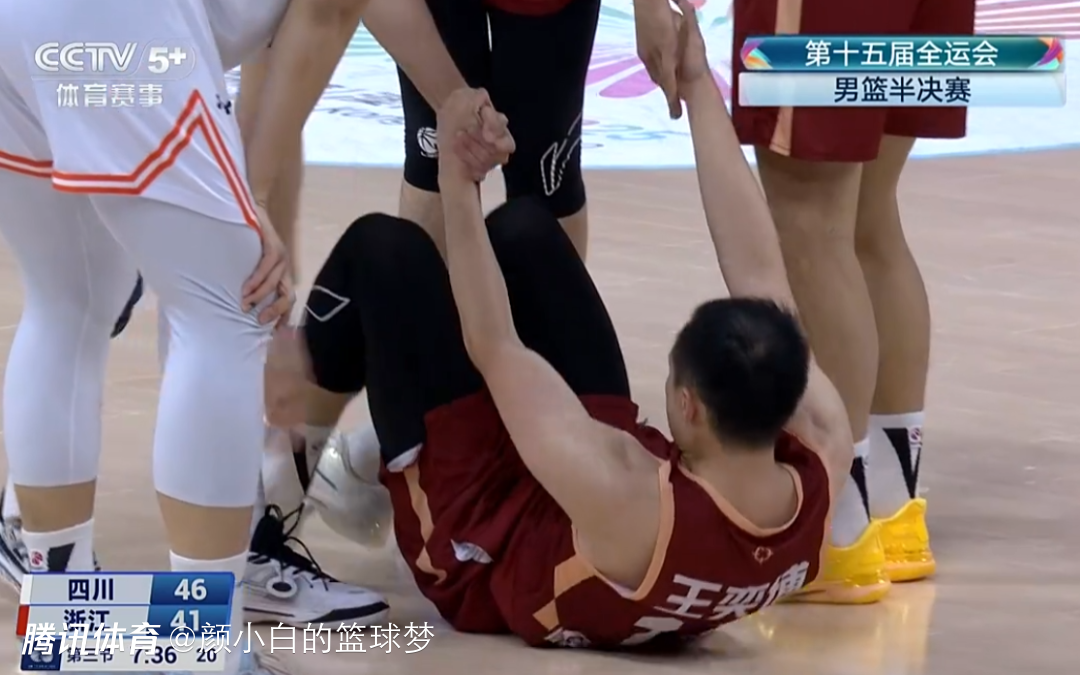 第三节王奕博挤过防守时倒地,膝盖撞了一下。
