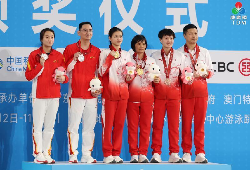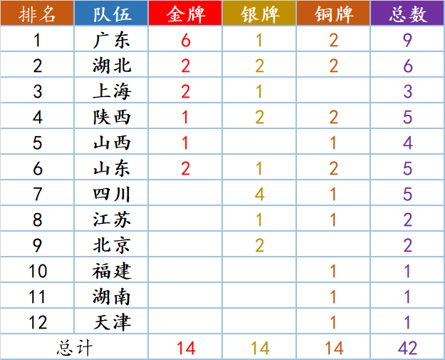 从奖牌榜来看,广东成为最大赢家,但与上届所创7金2银3铜的纪录稍有不及,主要是项目设置导致:上届有青年组四项跳台,但没有男/女一米板这两项;上届共有16枚金牌,本届只有14枚。而广东队上届恰好有1银1铜是从青年组斩获的...