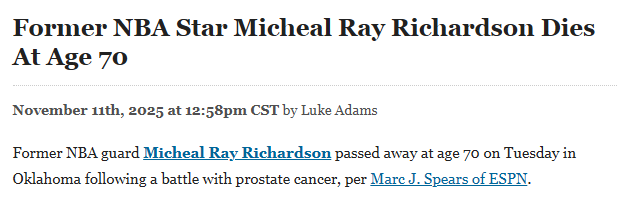 2025-11-12 06:40北京时间11月12日,据ESPN记者Marc J. Spears报道,前NBA后卫迈克尔-雷-理查德森于周二在俄克拉荷马州去世,享年70岁,他此前一直在与前列腺癌抗争。
