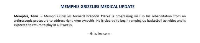 2025-11-12 06:50北京时间11月12日,灰熊队官方发布公告,宣布前锋布兰登-克拉克的膝部手术康复进展顺利,已获准开始逐步恢复篮球相关活动,预计将在约6至9周后重返赛场。