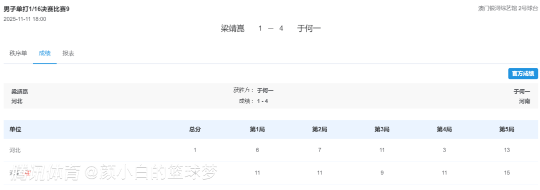 2025-11-12 07:10全运会男单1/16决赛爆出超大冷门,河南队的于何一4-1淘汰了河北队的梁靖崑,五局比分:11-6, 11-7, 9-11, 11-3, 15-13。于何一晋级16强,三号种子(世界排名第六)的梁靖崑一轮游。