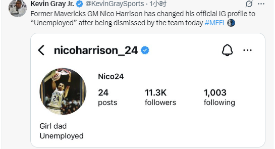 2025-11-12 08:20北京时间11月12日,尼科-哈里森在被独行侠队炒掉之后,更改了个人社交媒体的简介,目前哈里森的IG个人简介显示为“失业中”。