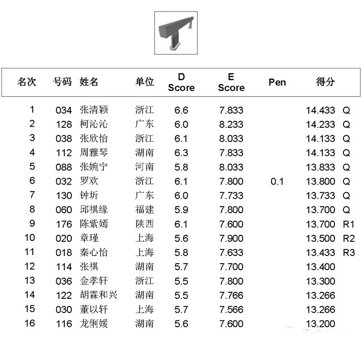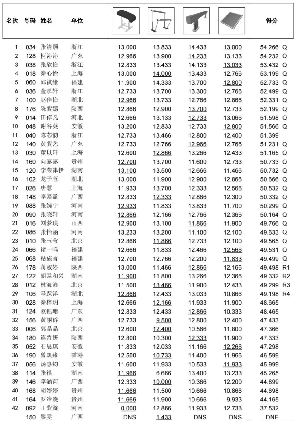 共计有43位选手参加全能项目的比拼,在三周前雅加达世锦赛上摘铜的张清颖,以54.266分名列第一;但广东新秀柯沁沁以0.034的微弱差距紧随其后,另一位浙江选手张欣怡以53.432排在第三。