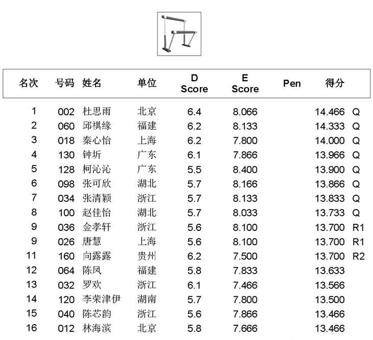 北京名将杜思雨以14.466分位列第一,之后是世锦赛冠军、奥运银牌得主邱祺缘,金牌争夺应该在两人之间展开。