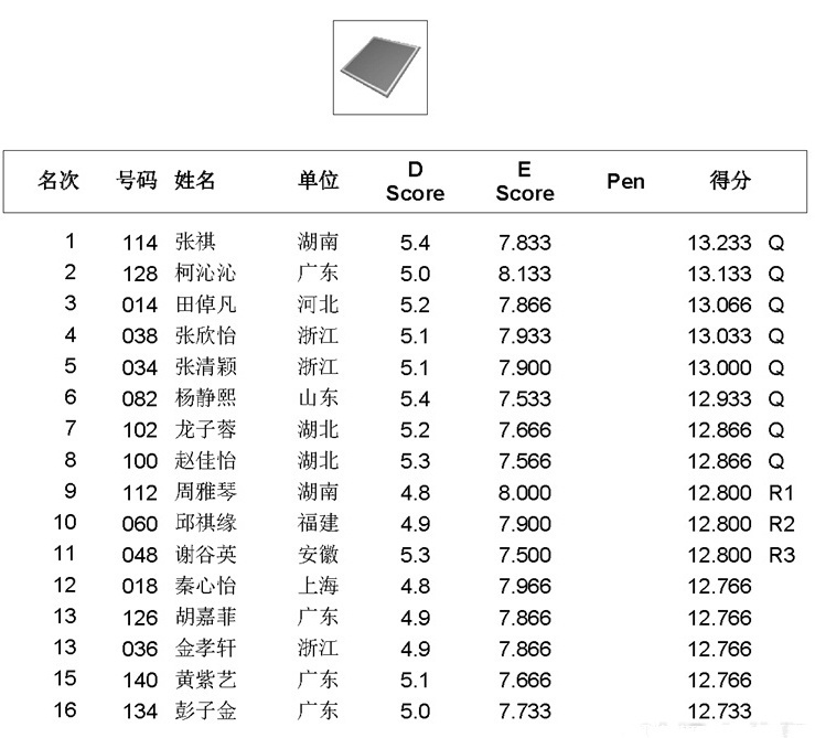 湖南队张祺爆冷以13.233排在首位,柯沁沁、田倬凡其实也不是擅长此项的选手。