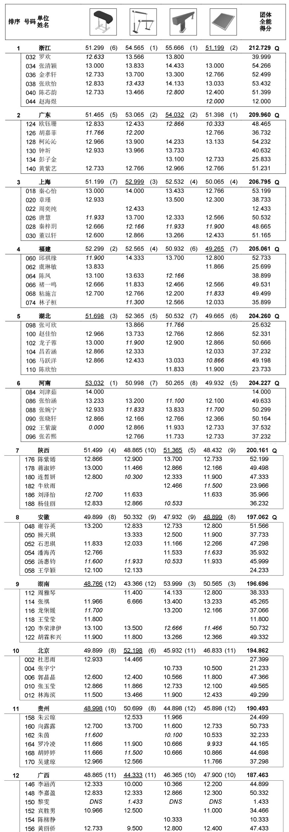 2025-11-12 08:40第十五届全运会竞技体操项目结束第二个比赛日的角逐:在女子资格赛里,浙江和广东排在团体前两名,而湖南队则因为弱项不稳以及整体伤病排在第九,惨遭淘汰!