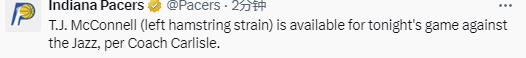 步行者官方:麦康奈尔复出 队内仍有6人会因伤缺战爵士