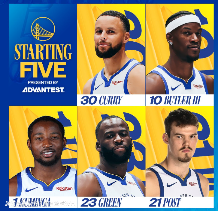 勇士队的首发阵容为:库里、库明加、巴特勒、德雷蒙德-格林、波斯特。库里此前因病已连续缺席3场比赛,此役他终于复出。