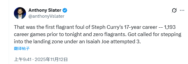 勇士队记者Anthony Slater写道:“这是斯蒂芬-库里17年职业生涯中吃到的第一次恶意犯规,在今晚之前,他出战的1193场比赛里,恶意犯规次数为零。他此次被判罚,是因为在以赛亚-乔尝试投三分时,踏入了对方的落地区域。”